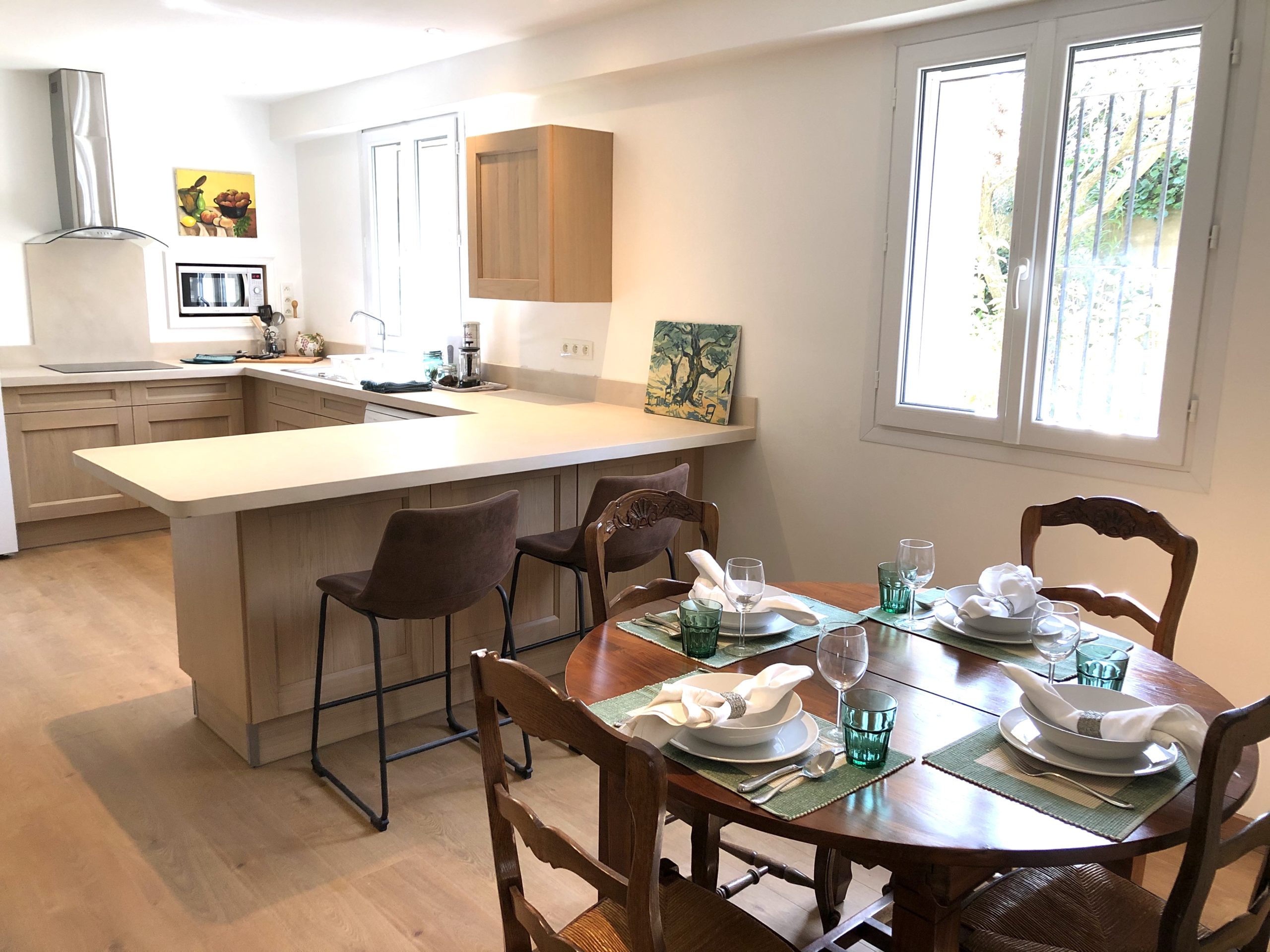 The second of our two apartments for rent in Carcassonne offers the perfect combination: a quiet neighborhood location and a 10-minute walk to everything. It has a garden view, a private entrance, one bedroom, and is spacious (about 800 square feet). If you’re arriving by train or plane, it’s just 1.5 km from Carcassonne’s train station and 5 km from Carcassonne’s airport. The apartment is completely new – we finished construction in March 2020. The duration of rentals can be one night through several months.