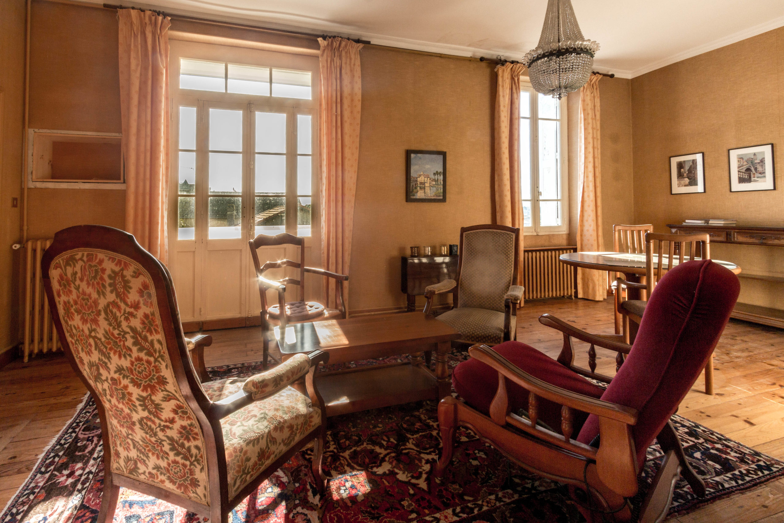 Sunny Salon/Dining Room with 10-foot ceilings and 6.5-foot-tall windows